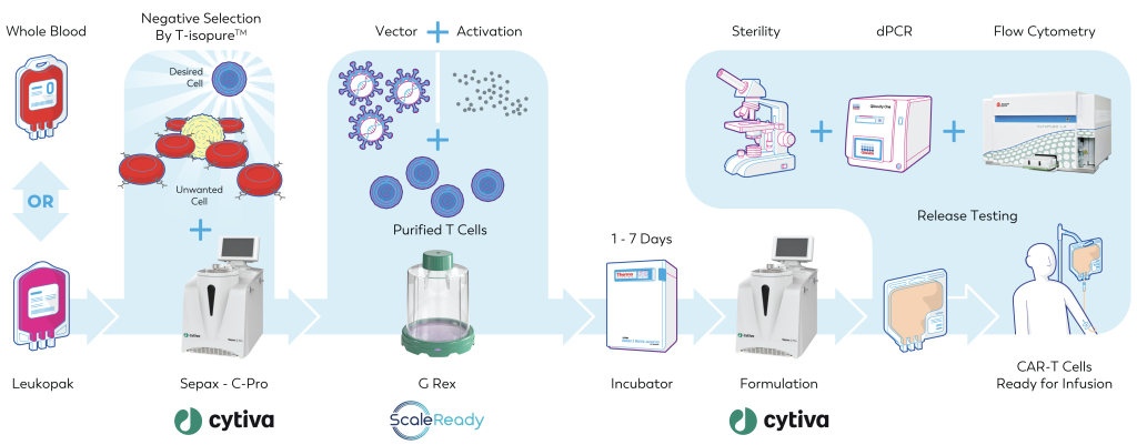 As shown, G-Rex is the bioreactor of choice for Caring Cross as a way “to build a low-cost CAR-T point-of-care production pipeline, at scale, that can be implemented in a dedicated clean-room or in a mobile clean-room setting”.